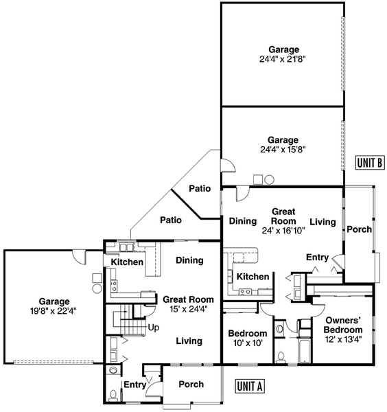 UNIT A totals 1343 sq. ft. and spans two stories with three bedrooms and two bathrooms upstairs, plus a direct-entry two-car garage. The open layout highlights a kitchen with raised eating bar, a dining area that opens to the patio, and a spacious great room perfect for gatherings. A powder bath, laundry nook, and under-stair storage maximize functionality, while the upstairs owners’ suite features a private bath with shower and convenient linen storage nearby. DETAILS UNIT A: Main Floor = 694 sq. ft., Second Floor = 649 sq. ft., 2 Car Garage = 460 sq. ft., 3 Bedrooms, 2 Baths, 1 Half Bath. UNIT B totals 998 sq. ft. and offers a single-level floor plan with two bedrooms, a split bathroom layout, and a direct-entry one-car garage, situated next to an additional two-car garage. This flexible garage arrangement is ideal for homeowners who want extra space for storage, hobbies, or recreational vehicles. Inside, Unit B mirrors the open-concept flow of Unit A, complete with a raised eating bar, great room, dining space, and easy patio access. A wide front porch enhances curb appeal and provides a welcoming entry. DETAILS UNIT B: Main Floor = 998 sq. ft., 3 Car Garage = 950 sq. ft., 2 Bedrooms, 1 Bath.